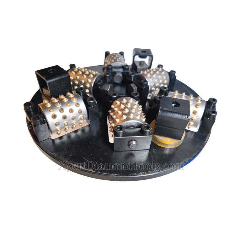 This 300mm bush hammer plate features 6 carbide rollers, designed to create a bush hammered profile/finish on the surface of granite, marble, and other stones. Each roller is equipped with 60 carbide tips, providing aggressive grinding. With 3 installers on the plate, it is compatible with manual polishing machines, modified bridge saws, and other bush hammering machines. The high-quality bearings and dustproof design extend the lifespan.